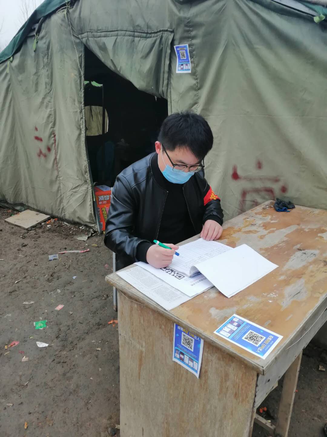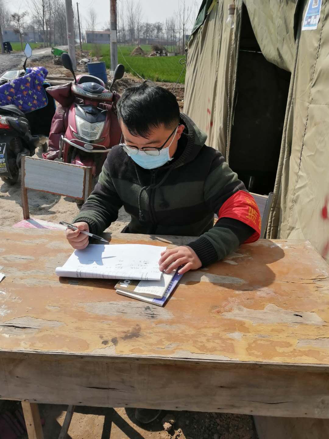 作为一名研究生,与村委会工作人员和当地群众相比,高凯年轻力壮,有着更加丰富的科学知识,于是他主动承担起关键卡口的执勤监测工作。每天从早上八点到晚上十点,“您好,请您下车配合我们体温检测和登记”、“谢谢您的配合”……虽然可能只是简短的几句话和不断的重复作业,但他也丝毫不曾懈怠。尽管午饭仅靠泡面充饥,他也无怨无悔没叫一句委屈。因为高凯和那些身在一线的工作人员有着一样的决心——面对战“疫”,不获全胜,决不收兵!