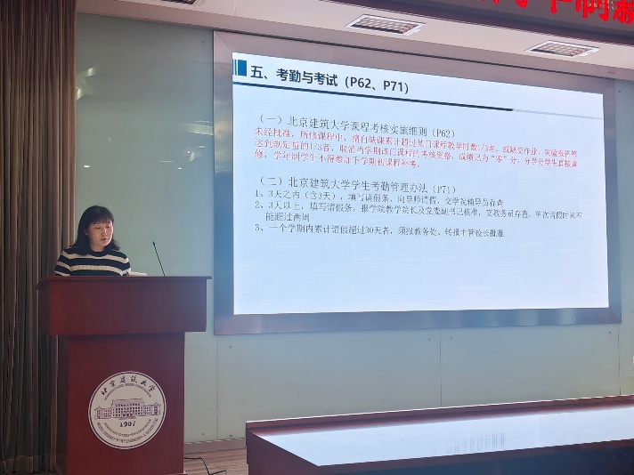 杨红粉为新生们进行了教学管理制度解读。她着重介绍了学分制度与绩点的计算方法、毕业学分要求、选课流程以及考试纪律等关键内容。她强调,学分是衡量学习量的单位,而绩点则是衡量学习质的重要指标。她建议新生们尽快熟悉教学管理系统的使用,科学规划每个学期的修读计划,重视每一门课程,为未来的升学和就业打下坚实的学业基础。