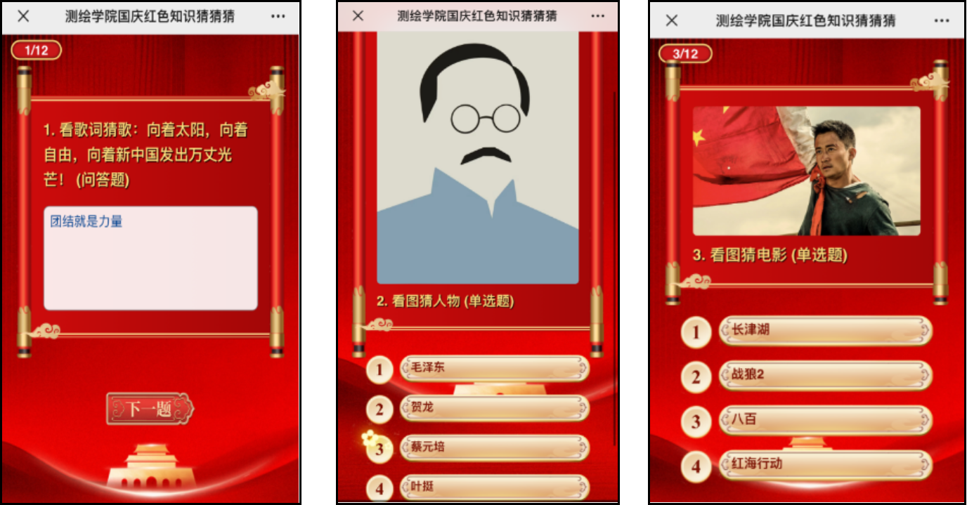 活动中设计了多种题型,包括“看图猜历史人物”“红色歌曲猜猜看”等。题目覆盖了丰富的历史知识和红色经典,激发了同学们的学习热情。活动期间,共有超过200余名同学参与了此次知识答题,展现了大家对红色文化的浓厚兴趣。