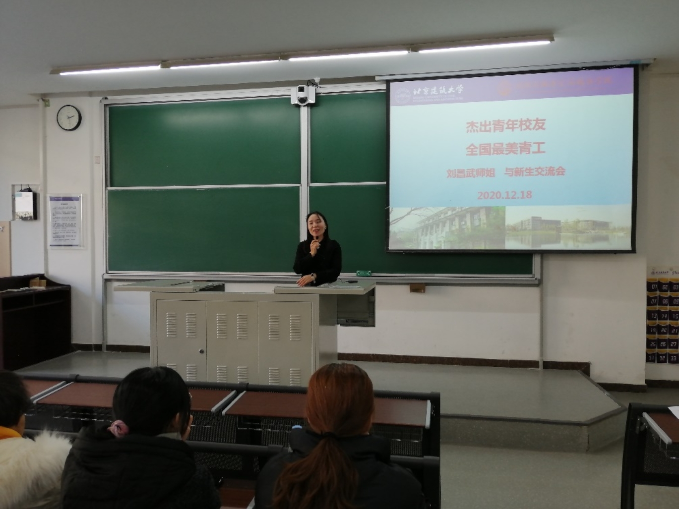 刘昌武通过分享自己在校学习经历、目前工作情况、求职就业历程、工作中的感受与体会、未来职业规划等方面和大家进行了交流,还讲述了自己学生时代和工作中的几个代表性片段,强调了对于“坚持”、“拼搏”、“精益求精”等精神和品质的认识。她表示学弟、学妹们正值青春年华,有着获取知识的广阔平台和汲取能量的最好芳华岁月,一定要规划好自己的大学生活,不断进步、全面发展、创造佳绩。同时,勉励大家“奋斗的青春最美丽”,“越努力越幸运”。同学们深受鼓舞,倍感振奋,对师姐的精彩讲述和真诚交流报以热烈掌声。