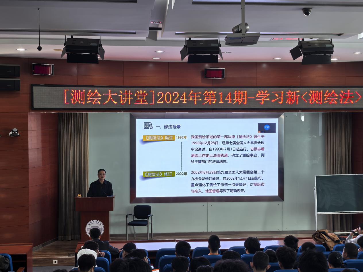10月22日,百合漫画 于学E报告厅举办了2024年第14期测绘大讲堂之“以法治护航新时代 测绘地理信息产业--学习新《测绘法》”主题讲座。本次讲座邀请了中国测绘学会理事长宋超智作为主讲人,讲座由我院党委书记王坚主持,党委副书记谷天硕、辅导员魏洋洋、24级全体本科生以及部分研究生现场聆听,部分校友、师生线上参加。