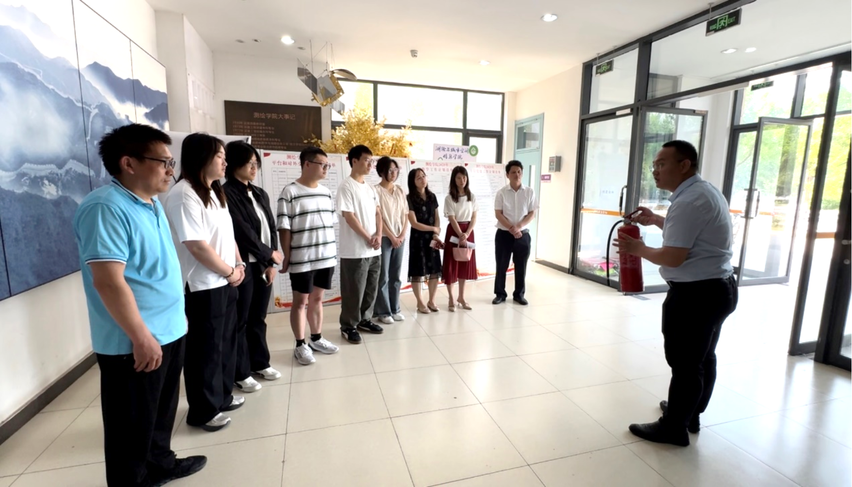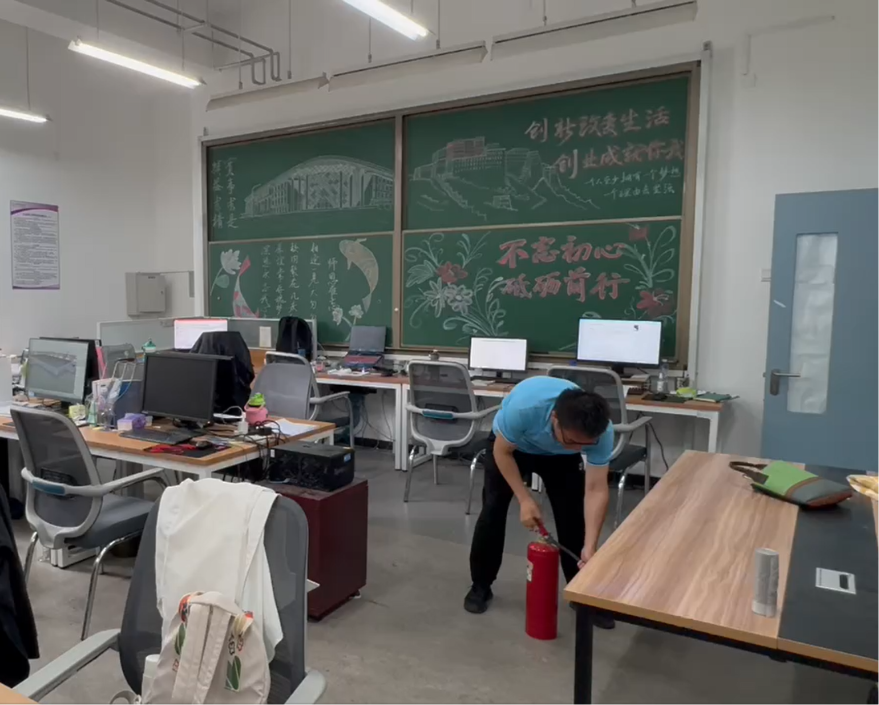 演练最后环节是保卫处开展消防器材使用教学,帮助参演师生直观掌握“一看二摇三拔四压”的灭火器操作要领。