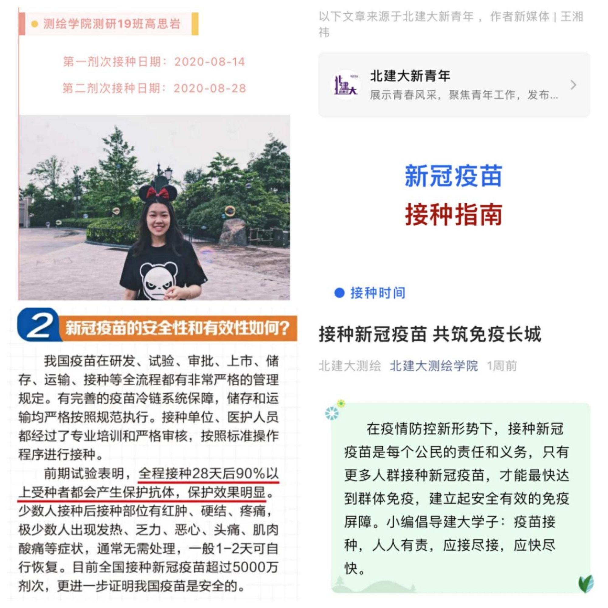 很早就已完成接种的测研19级高思岩同学说到:2020年8月份,有幸参加了服贸会志愿者的服务工作,并且主动接种了新冠疫苗,既是对自己负责,也是对家庭、对社会的贡献。接种疫苗流程很快,医生会询问自身的身体健康情况,如实回答就可以。不知不觉,完成接种已过去7个月,没有出现任何不良的反应。现在,随着新冠疫苗上市,越来越多的人参与接种,因此,我呼吁大家放心接种,组成群体免疫,是对重点人群生命健康安全负责,更是对全国人民群众生命健康安全负责,相信国家,相信我们自己。