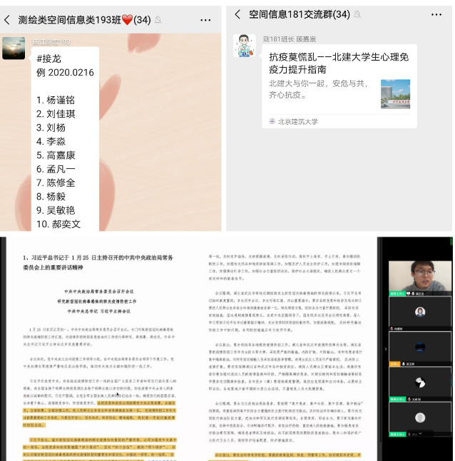 各支部积极号召支部成员制定学习计划,针对四、六级英语考试、考研、出国等做出规划,针对重点课程学习进行知识点梳理与分享,针对身体锻炼进行展示,引领团员青年度过一个充实的“非常时期”。如在主题团日活动上,遥171团支部学习委员邬安琪分享了假期学习计划,测172团支部王星宇分享了健身计划,遥161团支部贾镇恺分享了读书心得等。