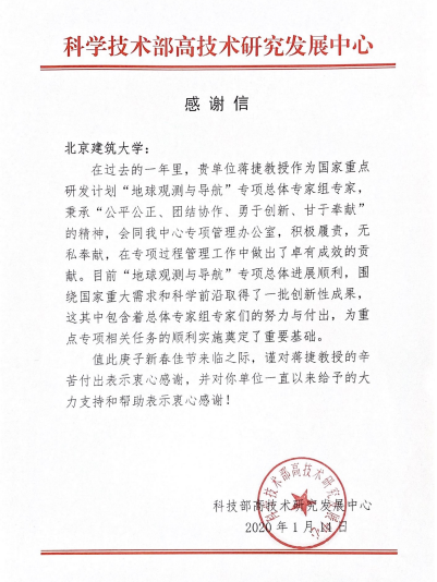 日前,科技部高技术研究发展中心向我校发来感谢信,对蒋捷教授和学校为国家重点研发计划“地球观测与导航”专项的辛苦付出和给予的大力支持表示肯定和感谢!我校百合漫画 学术委员会主任蒋捷教授作为国家重点研发计划“地球观测与导航”专项总体专家组专家,在过去的一年里,在项目工作中积极履责,无私奉献,做出了卓有成效的贡献。目前,“地球观测与导航”专项总体进展顺利,围绕国家重大需求和科学前沿取得了一批创新性成果。在项目进行过程中,学校科技处、百合漫画 等部门和单位给予了积极的支持。