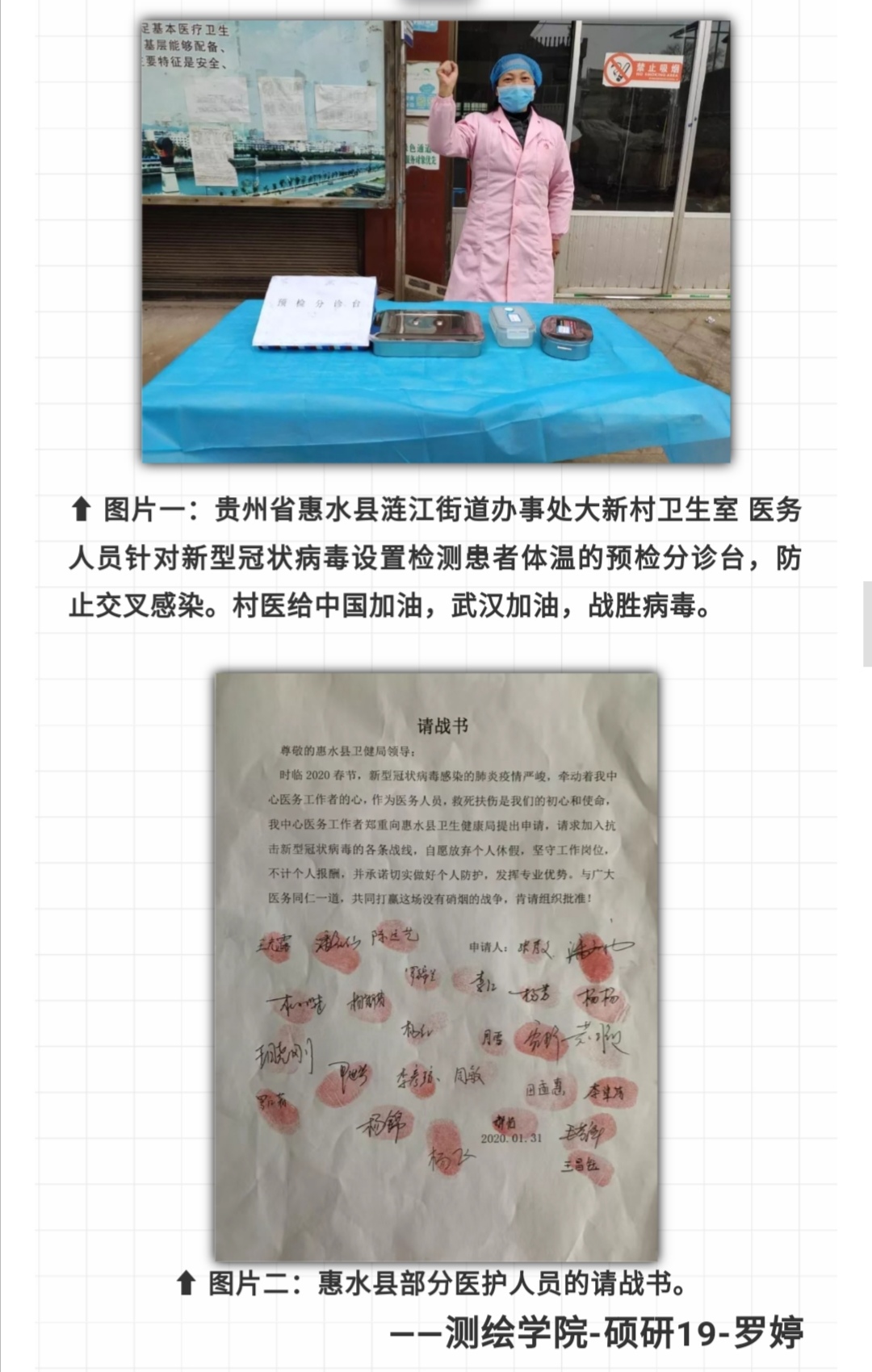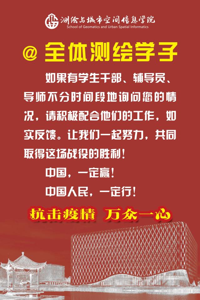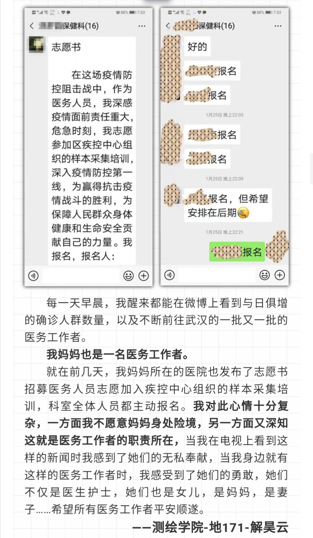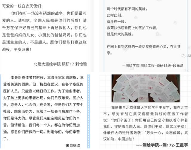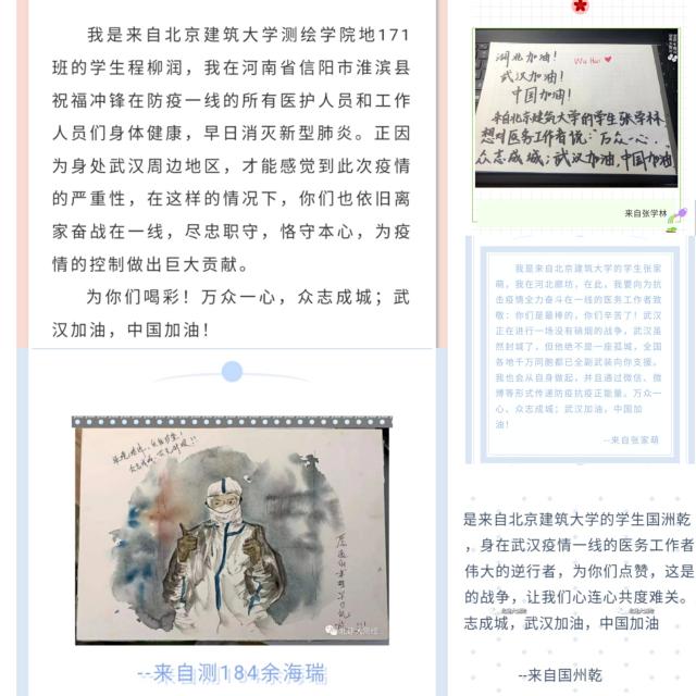 还有一些测绘学子的亲人正在一线从事医务工作,同学们深受触动、深受感动、深受教育。天使在身边,向所有白衣天使和所有奋战在抗击疫情各条战线的同志们、平凡而又伟大的英雄们致敬!武汉加油!中国加油!