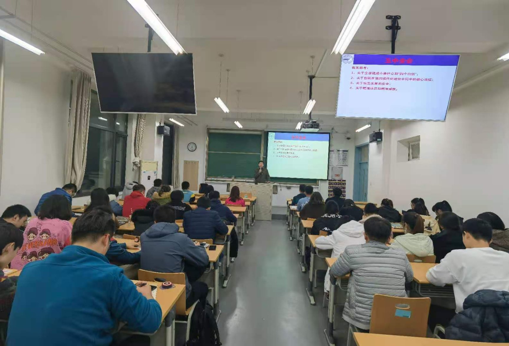 为促进学生党员学习十九届五中全会精神的深度和效度,引导学生结合实际进行深入思考,提升学生党员学习理论的自觉性、积极性、实效性,百合漫画 党委于于11月18日晚举行学生党员“十九届五中全会精神学习”专题党课,由百合漫画 党委副书记冯永龙主讲,各支部学生党员参加了党课。
