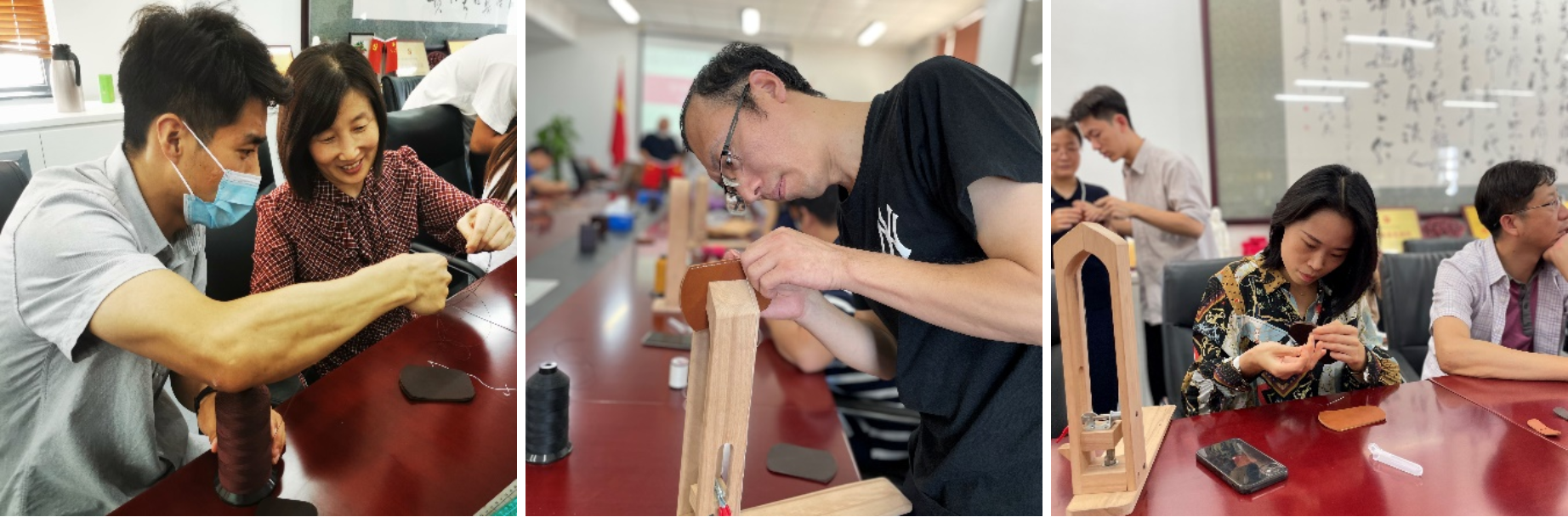 活动开始前,工程实训中心陈老师现场为大家讲解手工卡包的制作过程,从手工卡包的穿针、捏缝、抛光等进行一一传授和示范。在轻松愉快的氛围中,大家认真聆听老师的讲解、跟着老师的示范动作,手握着针线跃跃欲试,满是好奇与期待。在老师与志愿者的指导下,老师们学会了穿针、缝制,不一会儿缝制了半边卡包,看着自己手中的成果,大家十分欣喜,爱不释手。因为这或许是这二三十年、三四十年来自己亲手缝制的第一件手工作品,满满的成就感不言而喻。