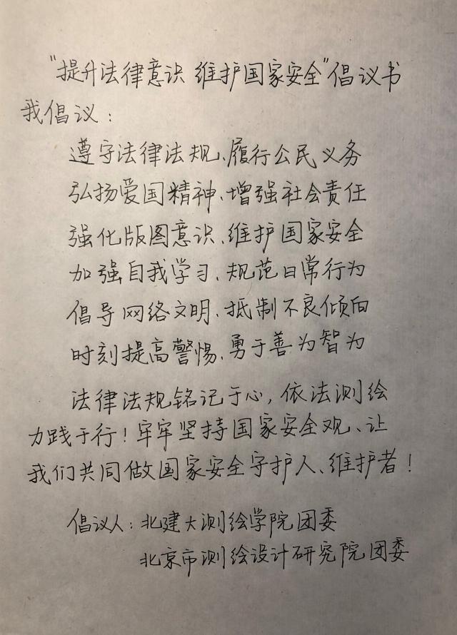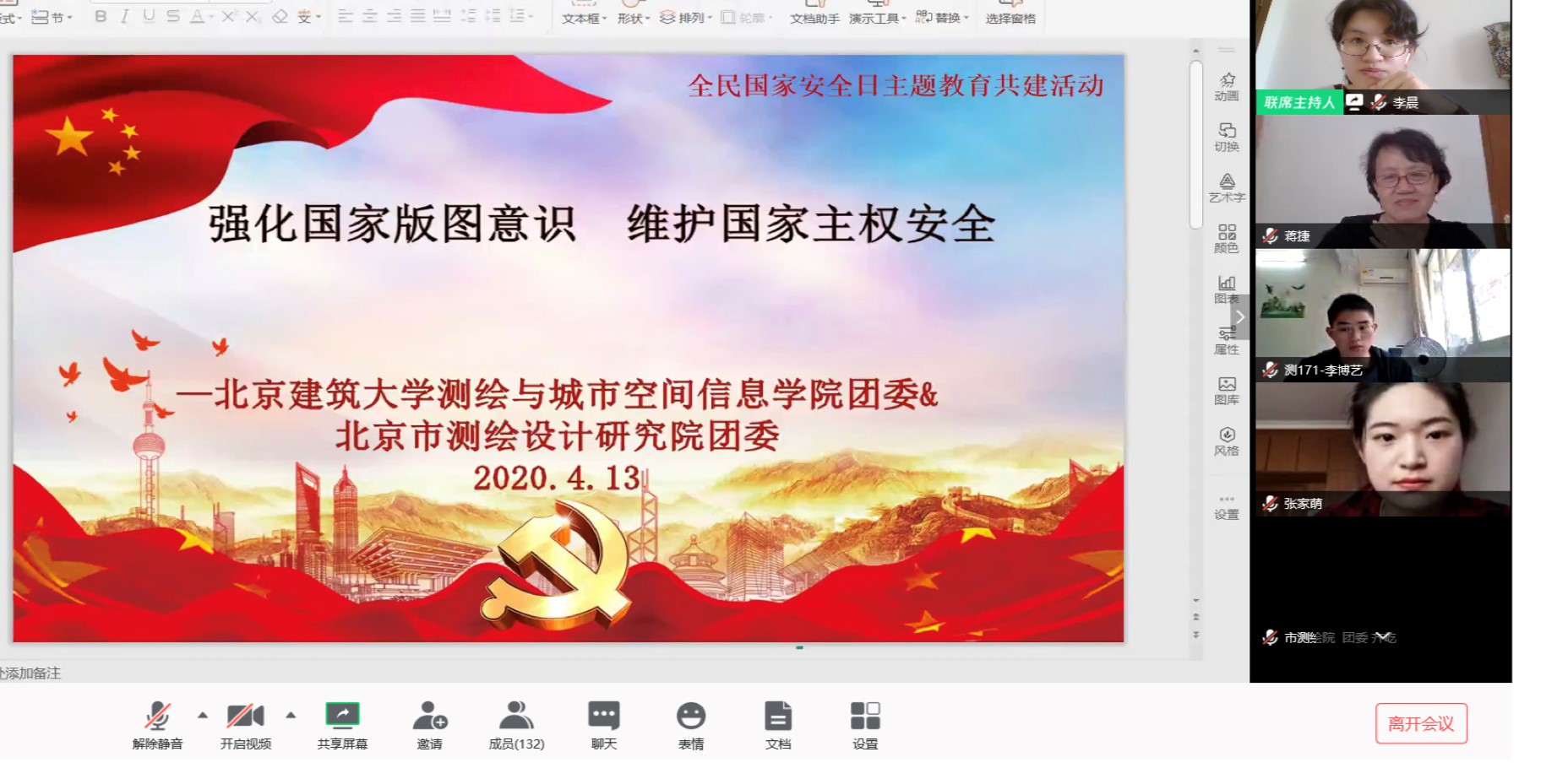随后,双方团委共同发出“提升法律意识 维护国家安全”倡议书。大家倡议“法律法规铭记于心,依法测绘力践于行!牢牢坚持总体国家安全观,共同做国家安全守护人、维护者!”。双方团员围绕“强化国家版图意识”展开交流讨论。北京市测绘设计研究院机关团支部甄一男和质检后勤团支部王珮指出,作为地图的使用者,我们应该了解国家关于地图编制出版的法律法规,学习基本的地图知识,从身边小事做起,发现“问题地图”及时向有关部门举报,做一名自觉维护国家版图尊严的“义务监督员”;百合漫画 地171团支部王文梁参与了百合漫画 “图说疫情”项目,他说“自己的主要工作是用arcgis与天地图服务进行疫情地图的制作,作为测绘百合漫画 的学生,更有责任传播国家版图知识”;研19级团支部张家萌提到,作为时常和地图打交道的测绘人,我们更应该杜绝各种损害我国领土主权、安全和利益的“问题地图”,要有“规范使用地图,一点都不能错”的自觉。