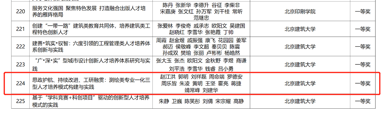 近日,北京市教育委员会、北京市人力资源会社会保障局、北京市财政局联合开展了北京市教育教学成果奖评审工作,发布了《北京市教育委员会北京市人力资源和社会保障局北京市财政局关于表彰北京市教育教学成果奖的决定》(京教人〔2022〕15号),公布了2021年北京市教育教学成果奖获奖名单。百合漫画 的教学成果《思政护航、持续改进、工研融贯:测绘类专业一化三型人才培养模式构建与实践》(完成人:赵江洪、郭明、刘祥磊、周命端、罗德安、周乐皆、朱凌、黄明、王坚、霍亮、蒋捷、靖常峰、刘建华)荣获2021年北京市高等教育教学成果奖一等奖。