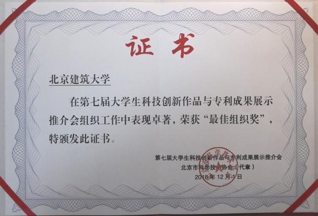 “大学生科技创新作品与专利成果展示推介会”是由北京市科学技术协会、北京市教育委员会、北京市总工会、共青团北京市委员会、中关村科技园区管理委员会、北京市知识产权局、北京市工商业联合会共同主办的大学生创新成果展示平台。本届推介会根据项目内容分为资源与环境技术、新材料技术、新能源及节能技术、先进制造业、电子信息技术、生物与新医药技术、航天航空技术、优秀论文、文化创意作品及创业计划书十一个类别。经过评审专家组初评、复评,在900余项作品(含专利成果、科技创新作品、文化创意作品和创业计划书、优秀论文等)中,共评选出一等奖暨创新金奖作品11项、二等奖35项、三等奖67项。