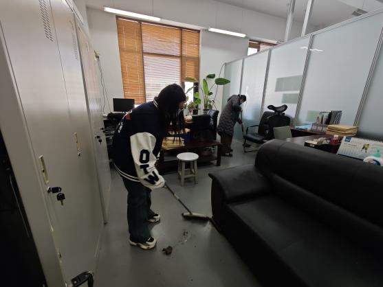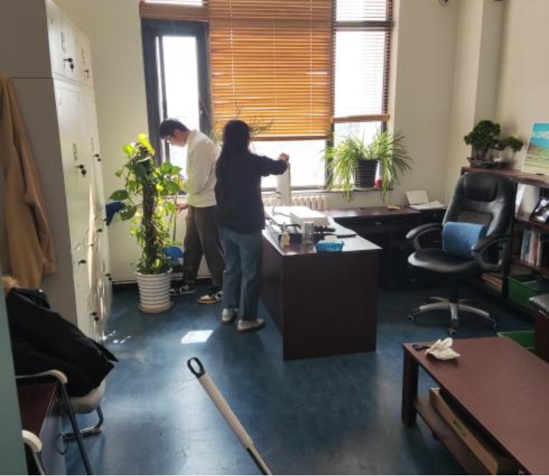 在劳动过程中,党员们分工明确、配合默契,展现出高度的责任感和奉献精神。第一党支部的胡超男注意到盆栽枯叶影响环境,不仅清理枝叶,还悄悄为绿植添水。“老师们平时忙于科研,我们想让他们推开门的瞬间就能感受到舒心。”经过一小时的奋战,十余间办公室窗明几净,物品摆放井然有序。