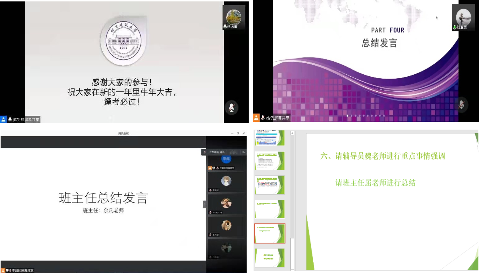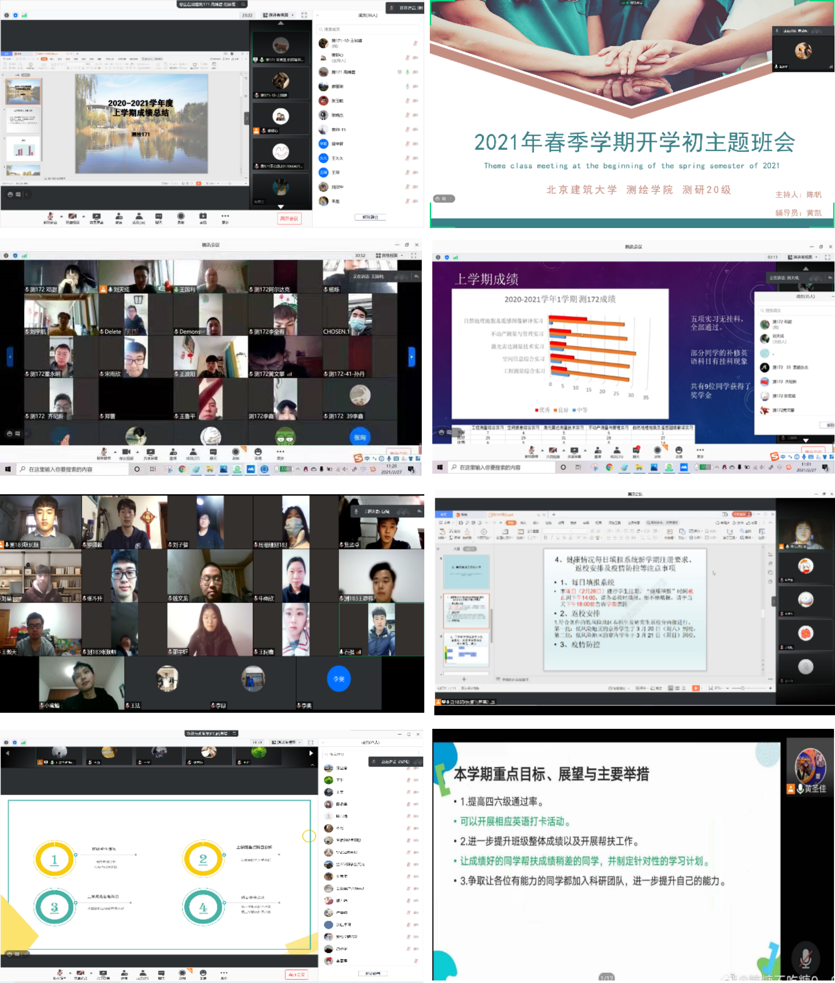 班会以视频会议形式召开。各班班会总结、分析了班级上学期学习成绩以及班级建设取得的成效和不足;结合假期活动安排,邀请学生代表进行寒假生活与收获交流分享;针对各年级不同重点任务,对本学期重点目标、展望与主要举措进行了说明与部署;传达了“学生健康情况每日填报系统”填报要求、新学期注册要求、返校安排及疫情防控等注意事项;详细了解新学期在线学习准备情况,提醒同学们假期即将结束,及时调整状态投入到新学期的学习之中。各班还结合班级实际交流了相关工作与特色活动。
