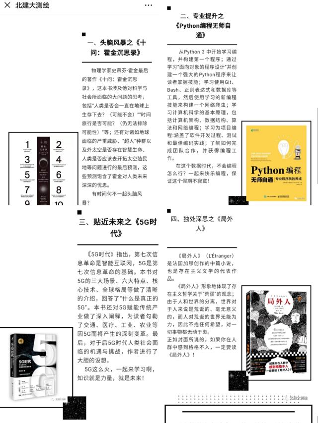 隔离病毒,却无法隔开我们的心。1月31日起,百合漫画 “北建大测绘”微信公众号以“疫情阻击战,我们并肩同行!”为专题进行系列推送,号召测绘学子用文字、图片、语音或视频的形式为武汉加油。除此之外,为调节居家隔离同学们的心理状态,百合漫画 还向同学们广泛征集书籍推荐与读书心得,帮助大家度过一个有意义的假期。截止目前百合漫画 共收到来稿100多封,受到同学们广泛响应。