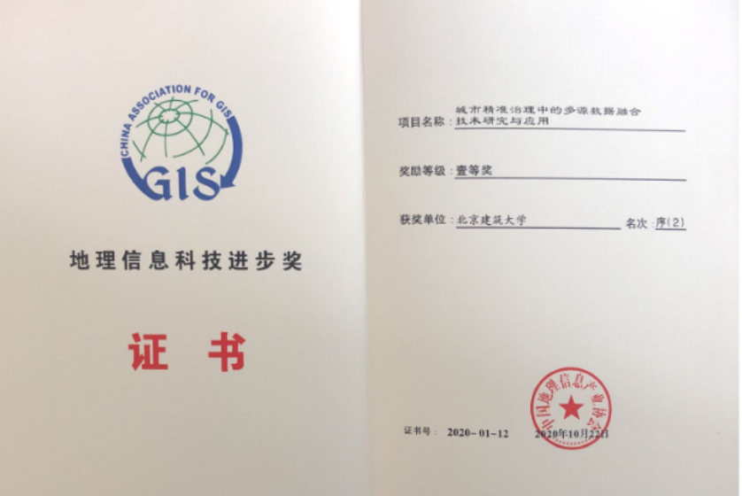 由中国地理信息产业协会组织评选的奖项中,我校为第二完成单位的“城市精准治理中的多源数据融合技术研究与应用”成果获地理信息科技进步一等奖(靖常峰教授为第二完成人)。该成果通过综合运用先进遥感、移动道路测量、时空数据分析等新技术为拆违实施提供了智能化技术手段,为政府决策提供了重要依据。部分成果应用于北京地理国情普查与监测、北京核心区控规和各区分区规划、城市体检、2022北京冬奥会场馆建设与保障工程。