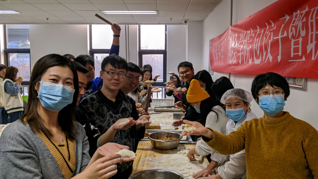 随后,包饺子活动正式开始。怎么擀面皮,怎么把饺子馅包严实,着实难坏了很多之前没包过饺子的同学。与之相反,在家中经常劳动的同学熟练地擀面皮、包饺子。同学们互相指导,互相鉴赏各自的成果,现场欢腾笑语、热闹非凡。
