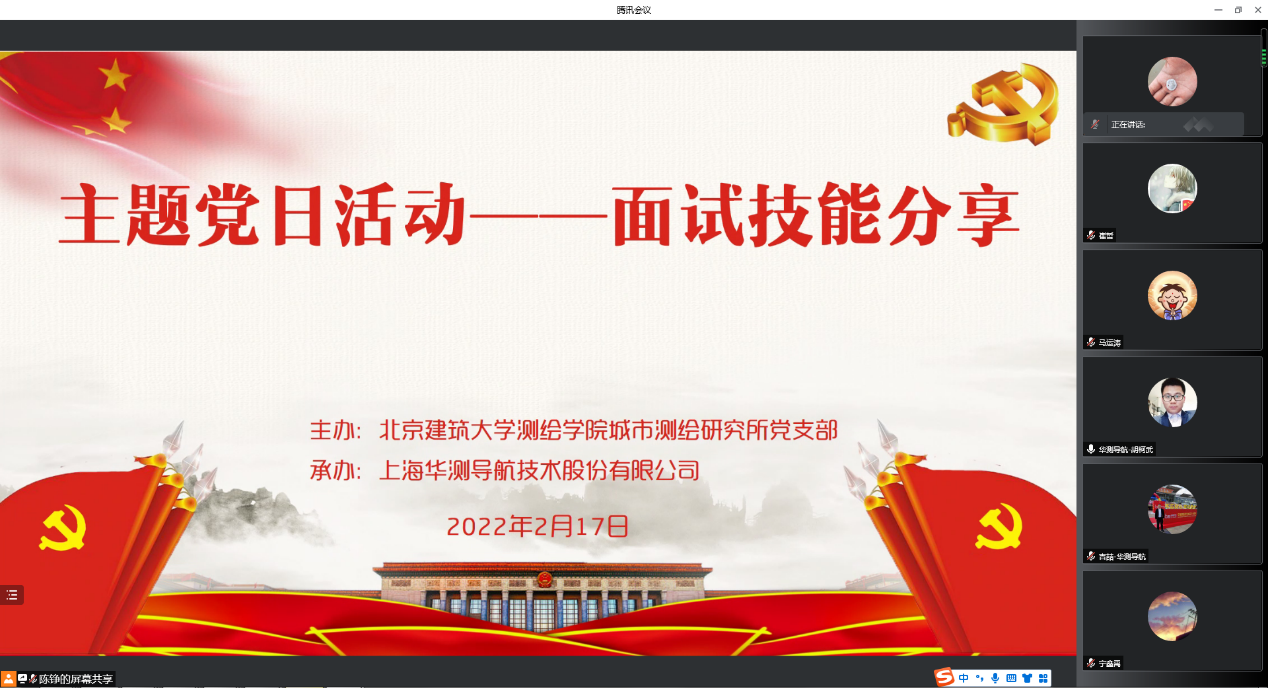 为进一步深入贯彻落实习近平总书记“七一”重要讲话精神,对照“九个必须”根本要求,扎实开展“我为群众办实事”活动,2月17日,百合漫画 城市测绘研究所党支部就求职面试技能分享召开主题党日活动。本次活动邀请了上海华测导航技术股份有限公司人力资源部经理胡柯武分享面试技巧。会议采用线上模式,由支部书记陈铮主持。参加本次活动的有百合漫画 党委副书记谷天硕、上海华测导航北京分公司经理吉喆,此外还有百合漫画 师生党员代表20余人。