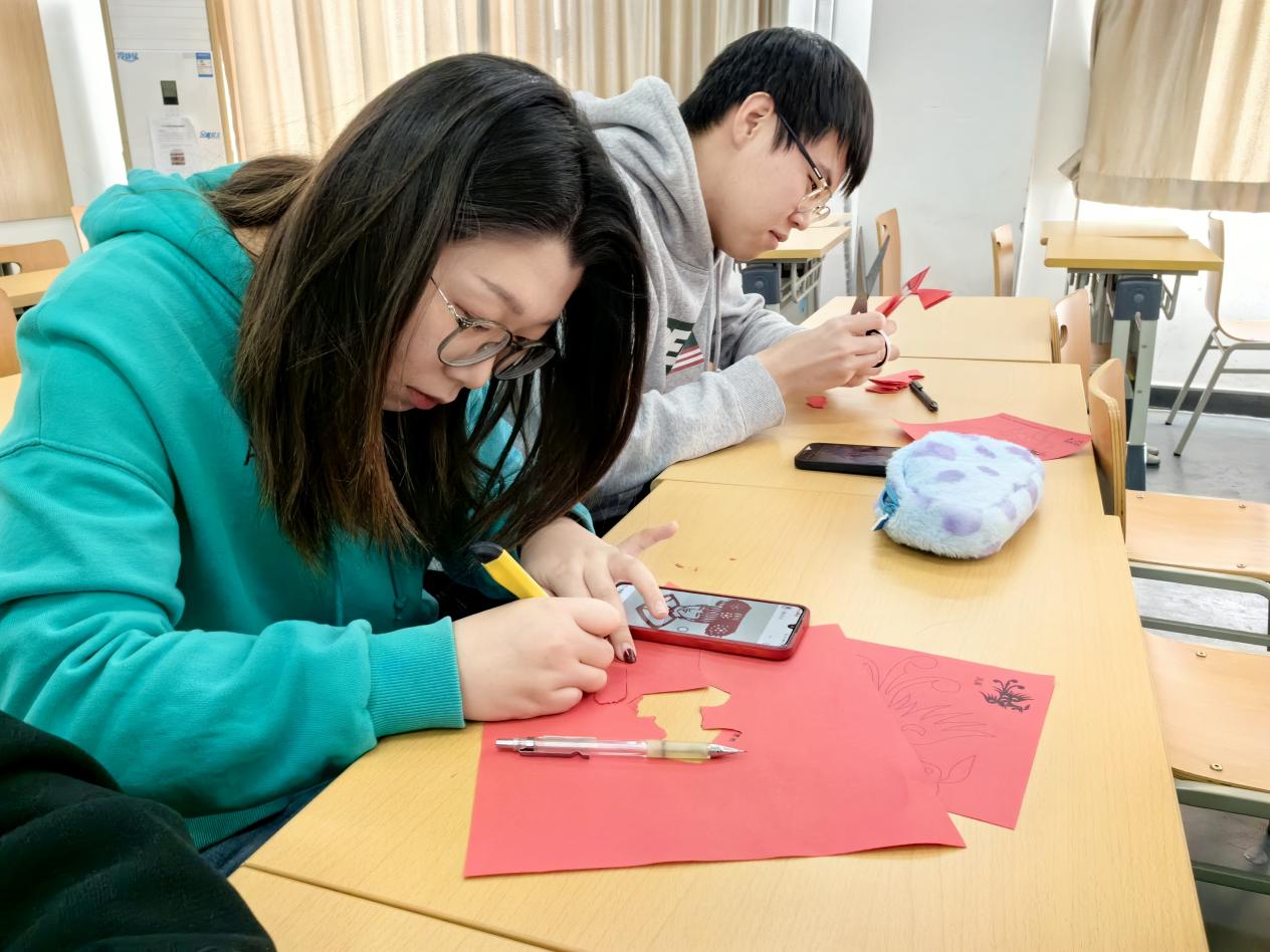 活动开始后,大家领取了材料包,迅速投入到剪纸的创作中。同学们在比赛中相互交流剪纸技巧,剪刀在彼此的手中灵活舞动,尽情体验艺术创造所带来的乐趣和成就感。新春佳节即将来临,大家分别选择了自己感兴趣的吉祥元素进行创作,有新年的“龙”字元素、“春”字元素、“喜”字元素等,在短短的45分钟内,伴随着欢声笑语,同学们展现出了精湛的剪纸技艺,创作出了精致多样的窗花和栩栩如生的生肖“龙”图案。观赏着自己亲手剪制的作品,每个人脸上都洋溢着满足和喜悦的笑容。本次活动在弘扬传统文化的同时,也让同学们放松身心,增强了“年味”参与感。