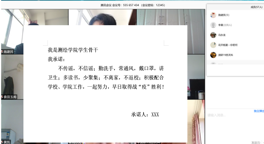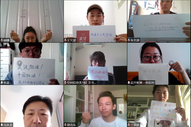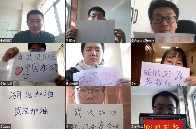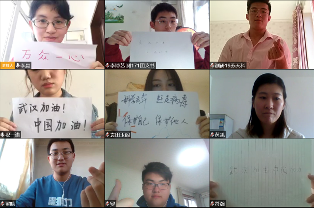 全体成员在线为武汉、湖北加油,同学们坚定表达与祖国一起并肩作战,尽早打赢疫情防控攻坚战的信心和决心。