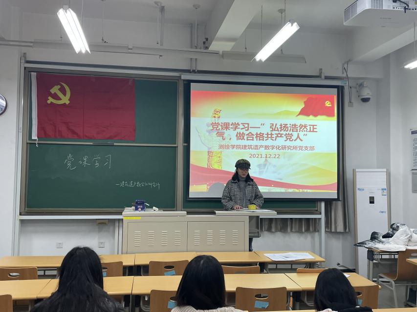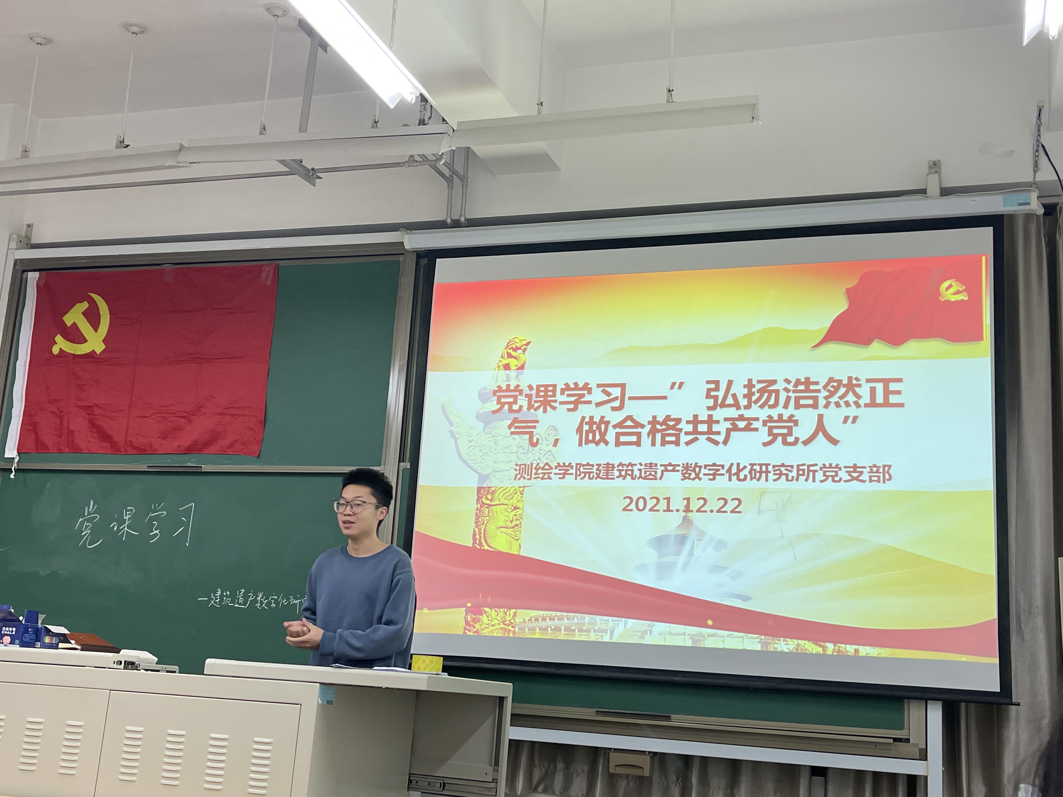 为帮助学生党员树立正确价值导向,坚定政治立场,提高政治敏感度,2021年12月22日,建筑遗产数字化研究所全体学生党员开展了以“弘扬浩然正气,做合格共产党人”为主题的党课学习活动。活动由支部委员国洲乾主持。