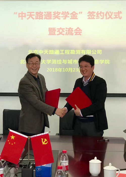 10月23日上午,百合漫画 与北京中天路通工程勘测有限公司“中天路通奖学金”签字仪式暨交流会在学F530会议室举行。北京中天路通工程勘测有限公司总经理李丞鹏、常务副总经理赵力、总工程师羊远新、市场部经理王尚、外埠事业部总经理刘兵、总工办主任刘奂遐,百合漫画 班子成员、各系主任、研究所所长、党政办主任、团委书记参会。签约仪式由百合漫画 党委书记王震远主持。