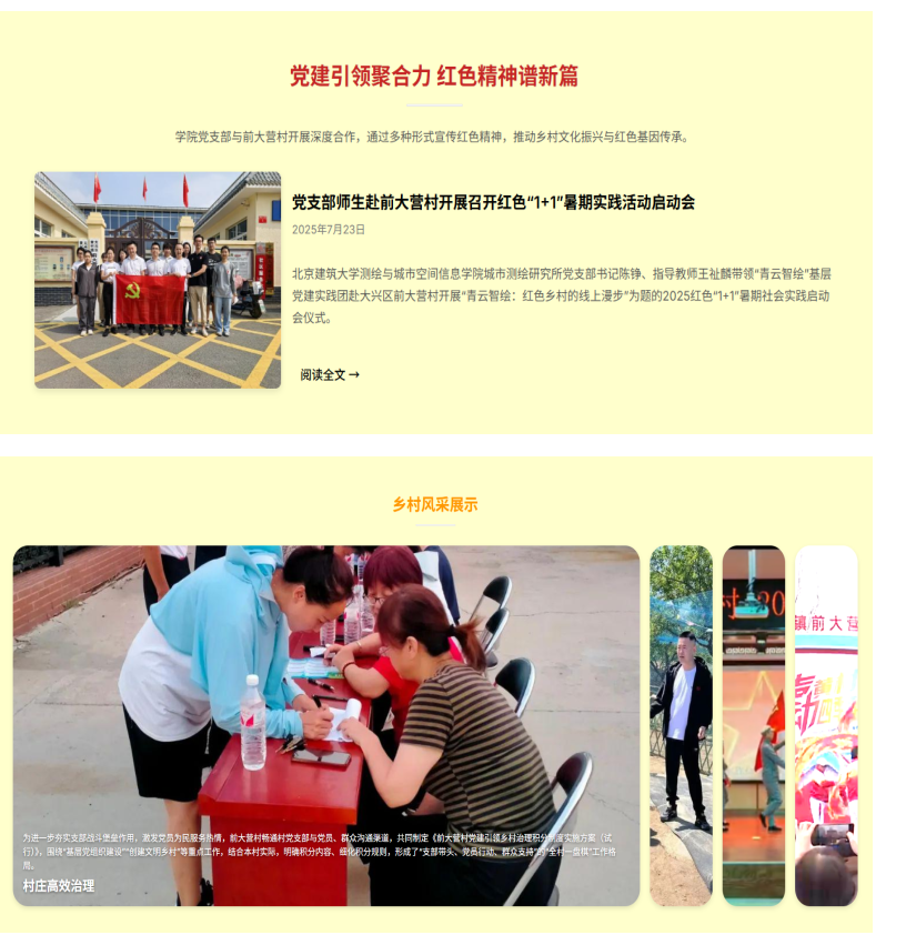 为深入贯彻落实习近平新时代中国特色社会主义思想,引导广大青年学生在与现实相结合的社会“大思政课”中“受教育、长才干、作贡献”,结合百合漫画 特点和专业优势,城市测绘研究所党支部书记陈铮、指导教师王祉麟带领“青云智绘”基层党建实践团赴大兴区前大营村开展“青云智绘:红色乡村的线上漫步”暑期社会实践活动。实践团经多次实地走访、数据采集、场景渲染,为前大营村制作了线上宣传网页,包括:全景游览、红色事迹、视频宣传、新闻模块、乡村风采展示等模块,网页链接://indoorinfo.cn/qdycun25/。