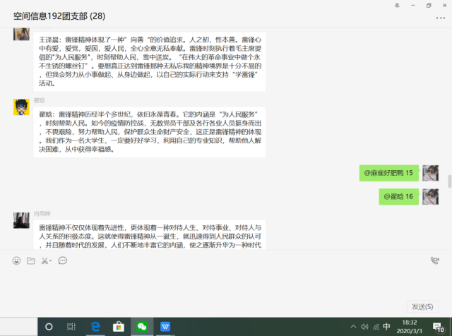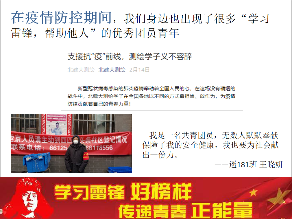 各团支部结合当前疫情防控要求和网络学习特点,通过网上交流、微信群互动、云团课、团日活动、网上观影等多种多样的形式开展雷锋精神学习。研18级团支部组织网上观影,王思宇同学观看了《青春雷锋》电影后,说到:“电影讲述了雷锋平凡的成长经历,用生动的影像和鲜活的人物形象展示了雷锋感恩社会、热爱生活、自强不息、艰苦奋斗、勤俭节约、助人为乐、全心全意为人民服务的精神,雷锋的一生平凡却又伟大。作为当代青年,我们要从自身小事做起,弘扬雷锋精神,积极面对生活,为社会做出自己的贡献”;遥181团支部在微信群里发起“我所理解的雷锋精神”话题讨论,畅谈学习雷锋的感受和体会;地161团支部在团日活动中围绕学习雷锋精神和疫情防控基础知识设置答题环节,同学们积极踊跃参与。