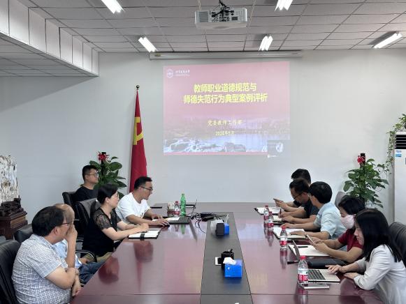会议首先邀请教师工作部陈亚飞做《教师职业道德规范与师德失范行为典型案例分析》专题讲座。陈亚飞从习近平总书记关于师德师风的重要论述切入,带领全体教职工共同学习了法律法规中有关师德师风的相关要求及新时代高校教师职业行为十项准则、学校师德“一票否决制”实施细则等师德行为规范。他重点通报了教育部曝光的师德失范行为典型案例,警示每位教师要以案为镜,恪守师德,树立底线意识,以身作则,绝不触碰“红线”。