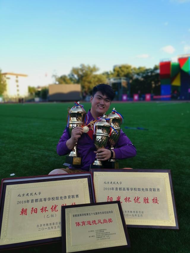 主要奖项和事迹:院学生会副主席、班级生活委员。曾获秋季大运会男子乙组铅球第二名;田径精英赛男子链球第八名;北京市春季大运会男子乙组铅球第四名;北京市春季大运会男子乙组链球第一名;担任校运会裁判。