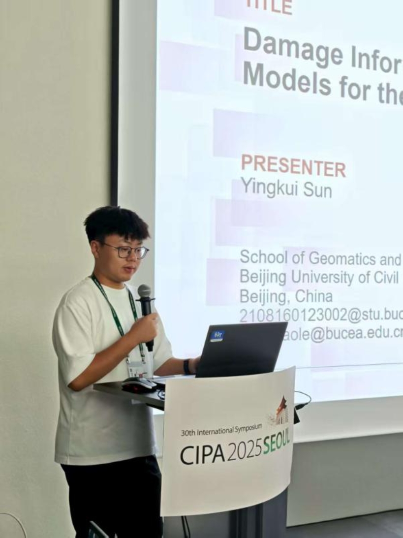 硕士研究生孙英魁做了《Damage Information Mapping from Images to BIM Models for the Detection of Ancient StoneBridges》的报告。提出基于图像识别与BIM集成的古石桥损伤智能检测方法,构建了“识别转换映射”的一体化技术流程。该研究能够实现裂缝、剥落等病害的像素级识别,并将结果映射至BIM模型中,便于后续的可视化管理与养护决策。