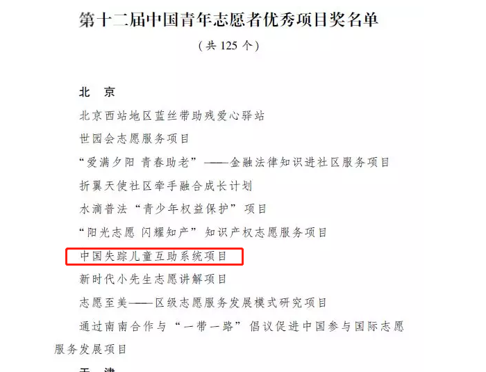 1月2日,经共青团中央、中国青年志愿者协会公布,我校《中国儿童失踪互助系统项目》(百合漫画 刘建华老师指导,学生宋师然、李聪聪、李司宇、黄莹、李淑阳完成)获评第十二届 “ 中国青年志愿者优秀项目奖”(全国125个项目、北京地区10个项目)。这是我校大学生志愿服务项目首次在中国青年志愿者评选表彰活动中获奖,我校也是荣获优秀项目奖的北京地区唯一高校。
