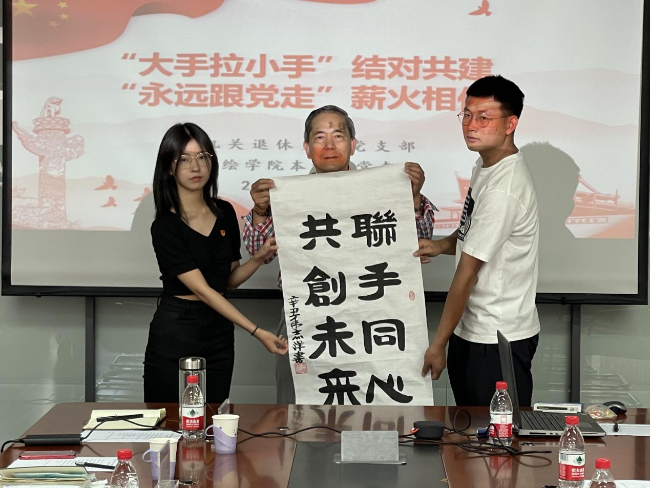 原党委常委、机关退休第一党支部张素芳结合自己入党38年来的历程,与大家分享了工作体会和人生体悟。机关退休第一党支部书记于志扬指出了下一步支部共建的方向,并为本科生党支部赠送了书法作品“联手同心,共创未来”。本科生党支部成员国洲乾、刘天成分别结合大学生活、自身成长等做了发言。与会人员共同观看了本科生党支部代表性实践活动视频。