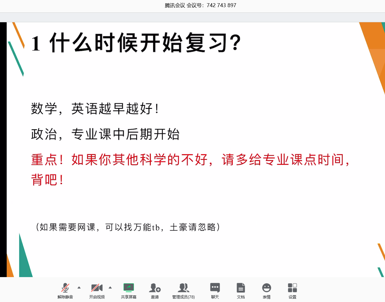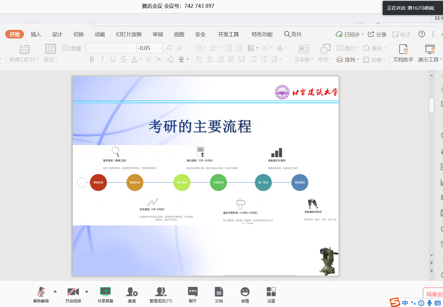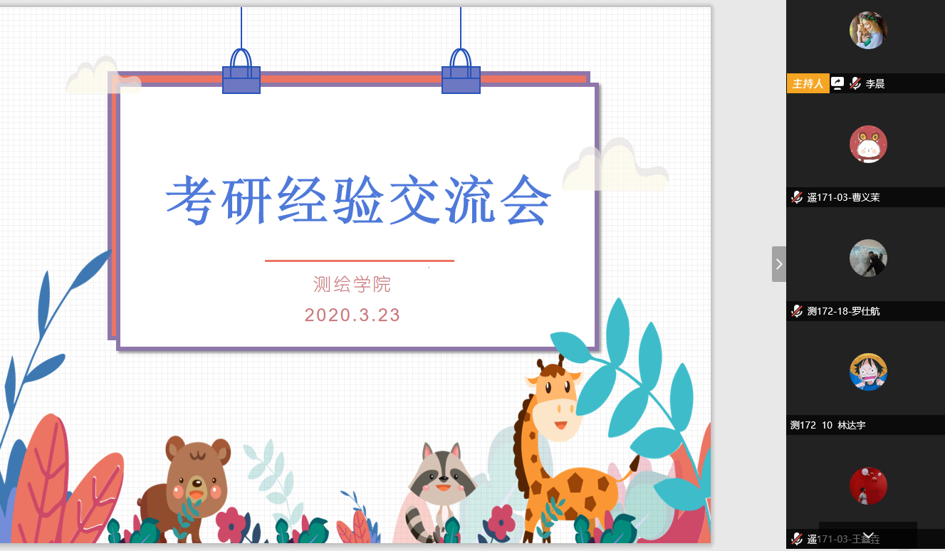 会议伊始,刘祥磊老师分别从为什么考研、考哪里、如何复习等方面进行了介绍,并解读了考研相关政策,就同学们关心的问题进行了解答。交流会上,三位16级学长学姐结合亲身经历为同学们分享了宝贵的经验。测162班马朝威介绍了自己的考研过程,分享了考研心得,强调重在规划和坚持;地161班马腾跃在专业课复习方面给同学们提出了一些实用建议;遥161班刘洋向同学们展示了自己的考研复习规划表,同时也提醒同学们注意在考研过程中劳逸结合,调整心态。接下来,同学们进行了交流。最后,李晨老师希望同学们坚定考研信心,进一步做好规划,在家期间合理安排时间。