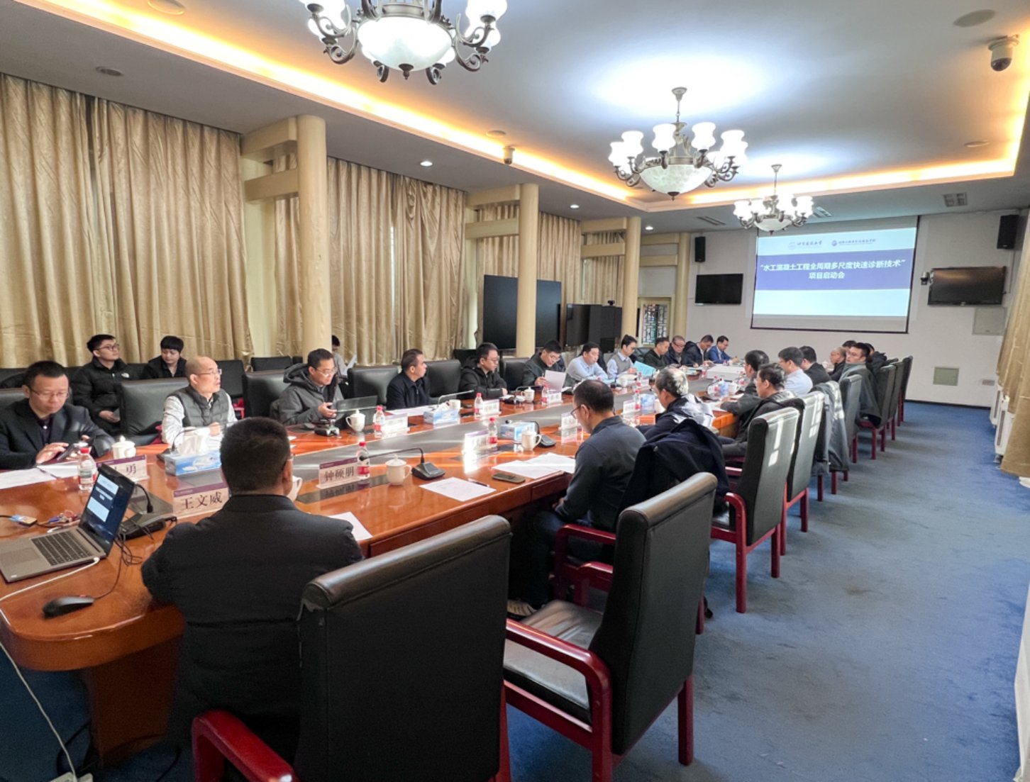 项目负责人刘祥磊教授系统汇报项目总体情况。该项目涵盖远距离结构安全检测评估设备研发、非接触混凝土结构表观缺陷监测设备研制、水工混凝土结构数字孪生精准建模系统研发、混凝土结构安全评估和寿命预测平台等 7 项核心任务,刘祥磊教授详细阐述项目总投资概算、资金使用方案及实施进度计划。
