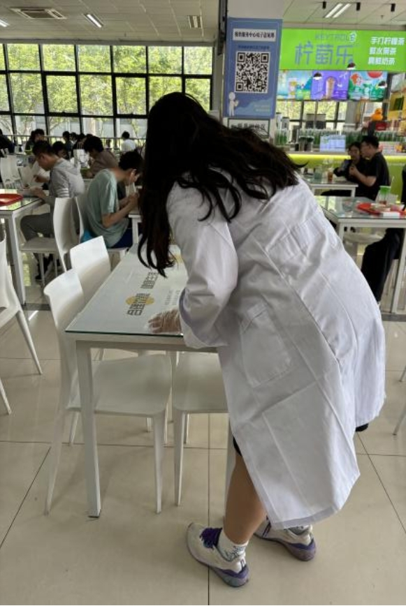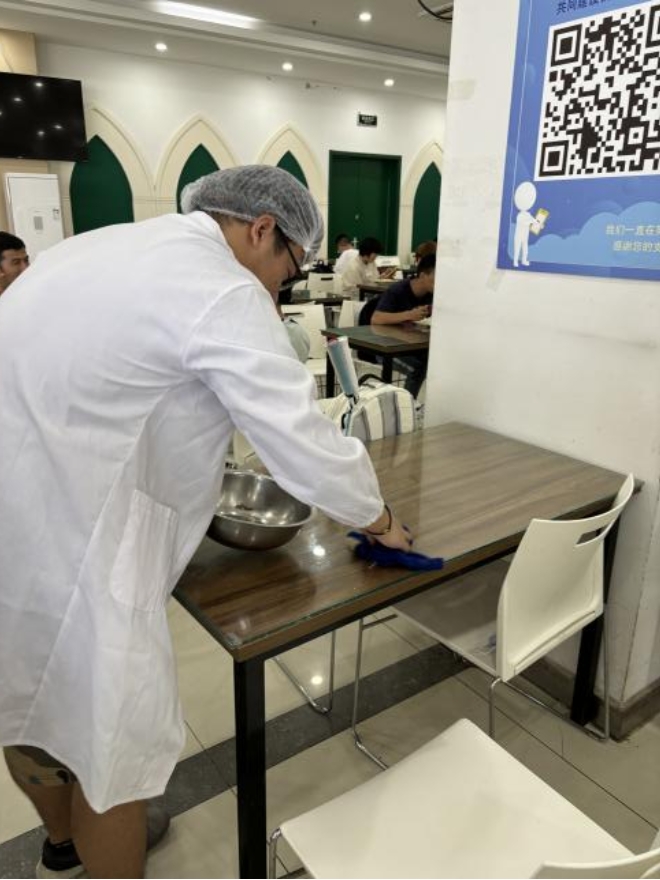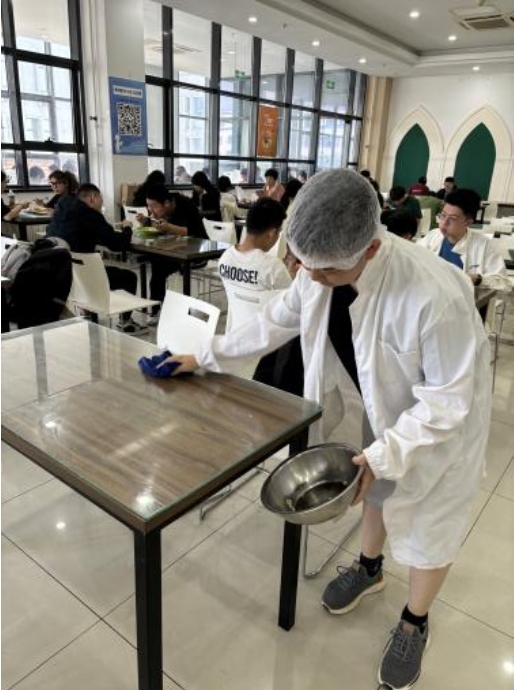 在值班区域,同学们坚守岗位,密切留意食堂内同学的用餐情况,确保每位同学都享受到满意的用餐体验。收盘区域的同学则忙碌而有序的收拾餐具,保证分类的准确性。清洁区域的同学们拿着抹布、拖把等工具,对食堂餐桌、地面等区域进行细致的清洁工作,确保食堂环境的整洁和卫生。