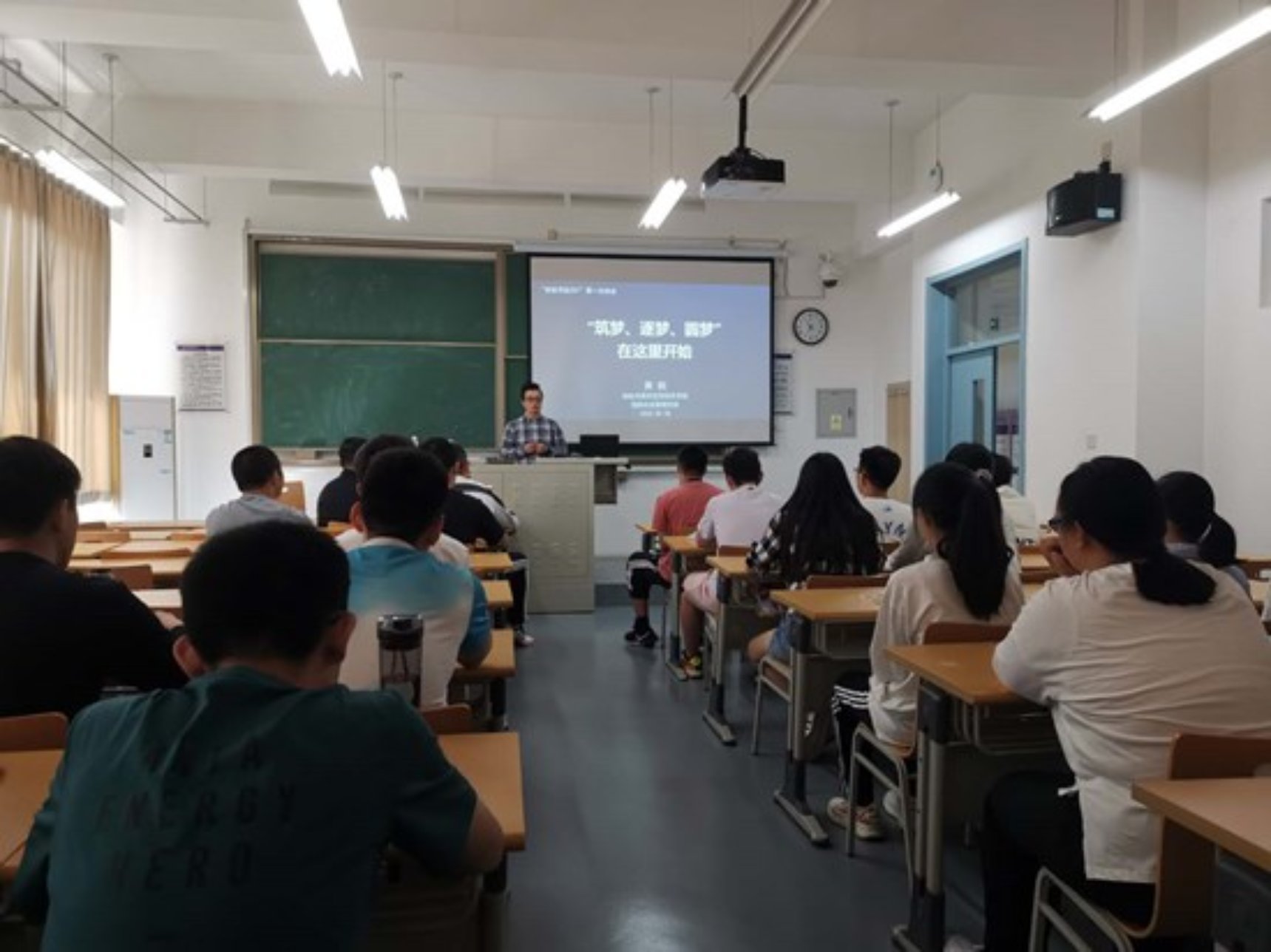 新生班主任黄鹤、屈利忠、徐世硕、刘亚男、新生辅导员魏洋洋对有关问题进行了讨论交流。会后,班主任主持各新生班召开开学初第一次班会。师生在班会上做了自我介绍,老师们对同学们的大学生活提出了希望和建议,希望在师生共同努力下,新的班集体“乘风破浪,扬帆起航”。