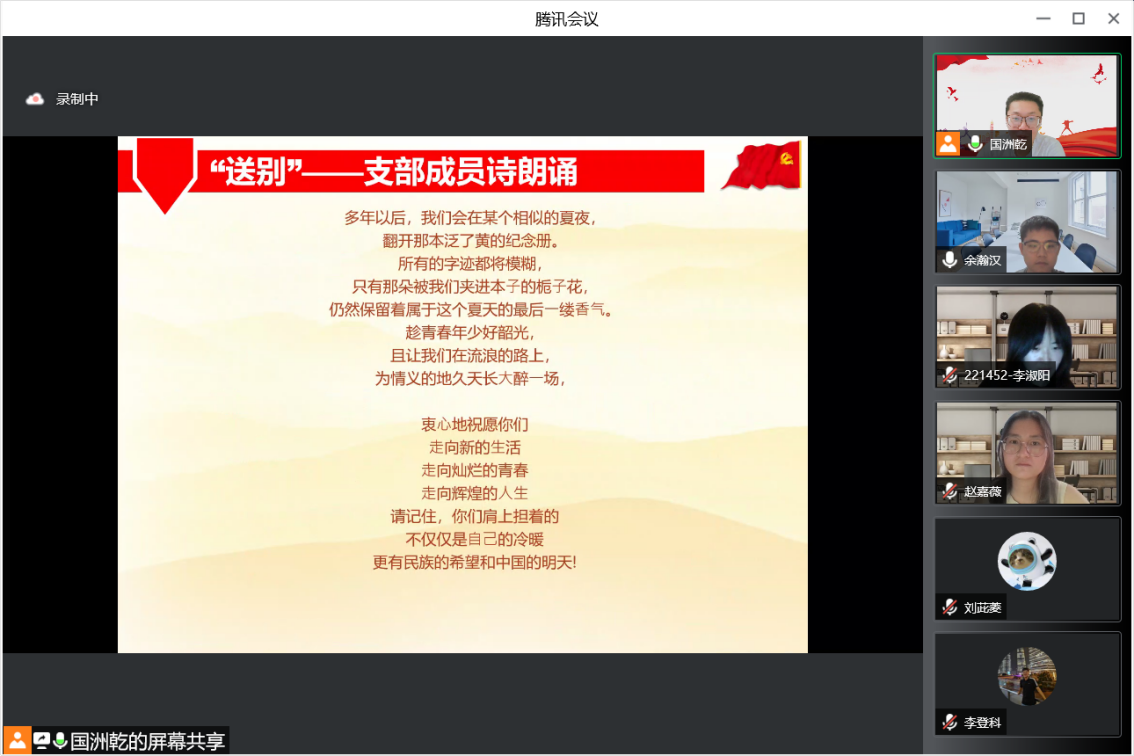 首先,支部研一党员代表国洲乾,李淑阳,华新楠,尹利莎,王鑫,唐星雨,赵嘉薇,郝务宸,余瀚汉9位同志采用云端诗朗诵的形式,向毕业传达了祝福与感激,用一首“送别”祝福毕业生在人生新阶段继续筑梦未来,扬帆远航。