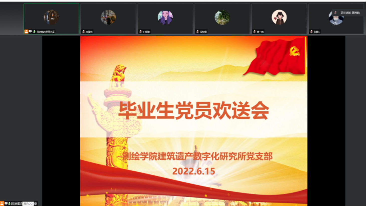 为进一步丰富党支部组织生活的形式和内容,并送别即将奔赴工作岗位与踏上更远求学之路的2022届毕业生,建筑遗产数字化研究所党支部于6月15日召开“云端诗朗诵,欢送毕业生”主题党日活动暨毕业生党员欢送会。支部全体党员、发展对象与积极分子参加,支部组织委员国洲乾主持。