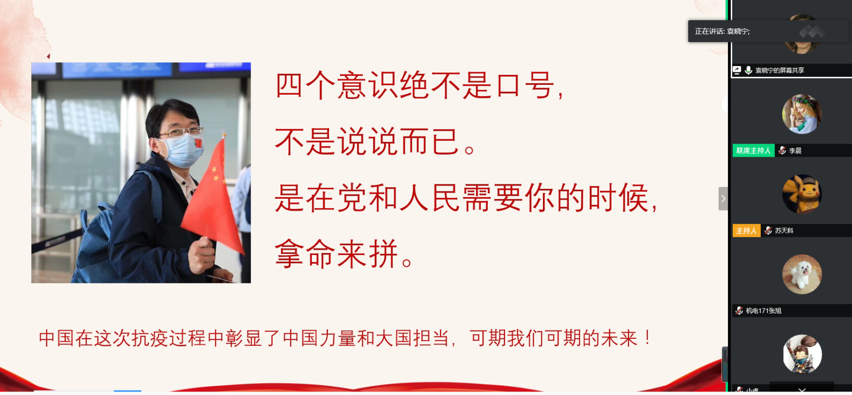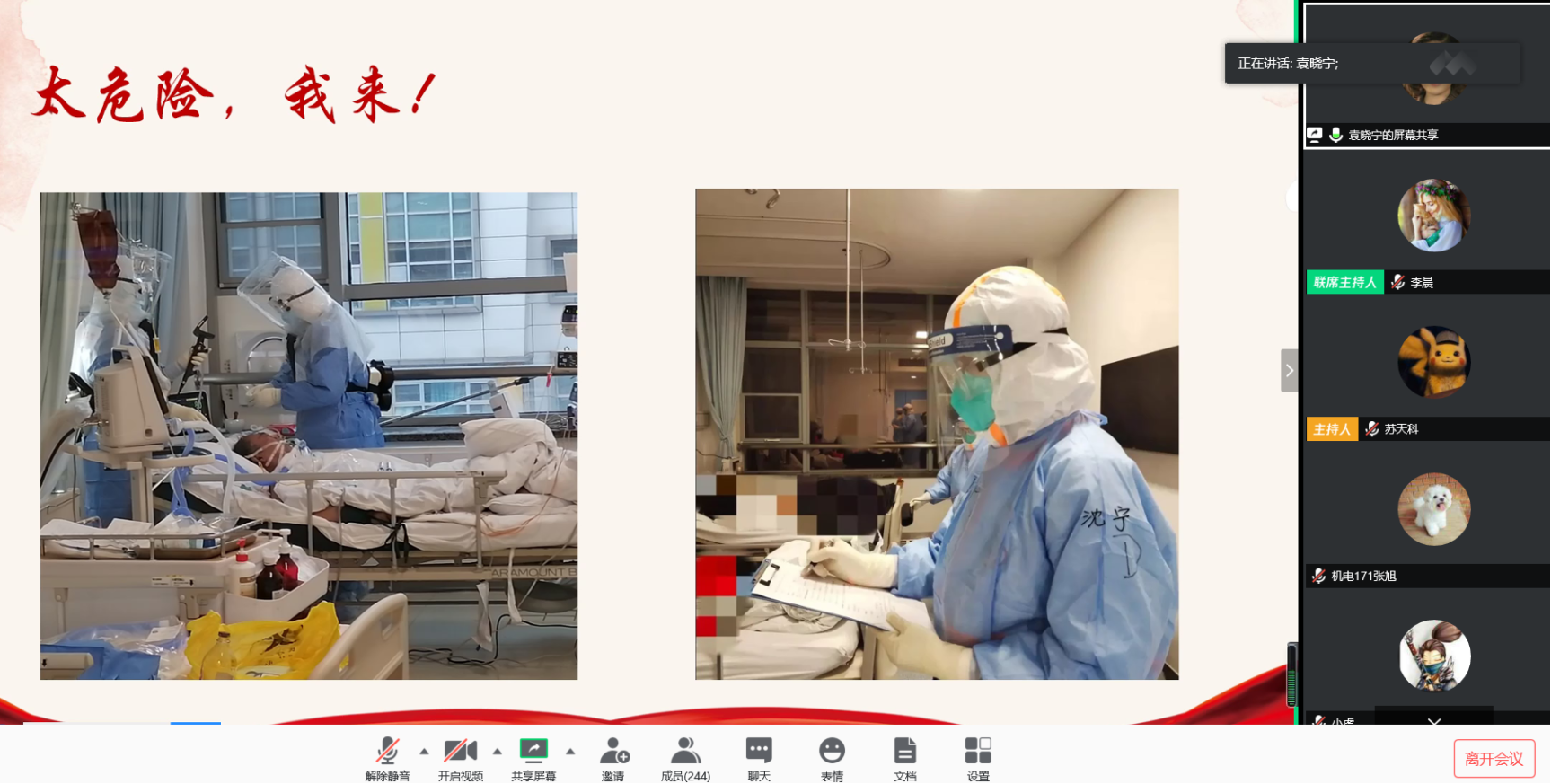 袁大夫用朴实的语言,结合自己在援鄂期间的真实战疫经历,深情讲述广大医护工作者的“逆行”故事。他们第一时间到达武汉投身抗疫第一线,完成了本院医疗队员的院感防控培训与考核,并帮助多家医疗队进行院感防控培训,全天24小时接受线上咨询;先后与多家医疗队合作开创病房,与感染防控同道紧密合作,迅速确定病房改造方案和工作流程,并在多家医疗队得以推广使用;深入临床一线,将感染防控工作做到队员们的身边,做到患者的床旁,随时解决临床运行中发生的问题。袁大夫表示,祖国是我们最安心的家,党和国家为一线的医护人员提供了全方位的保障和支持,中国在这次抗疫过程中,彰显了中国力量和大国担当。