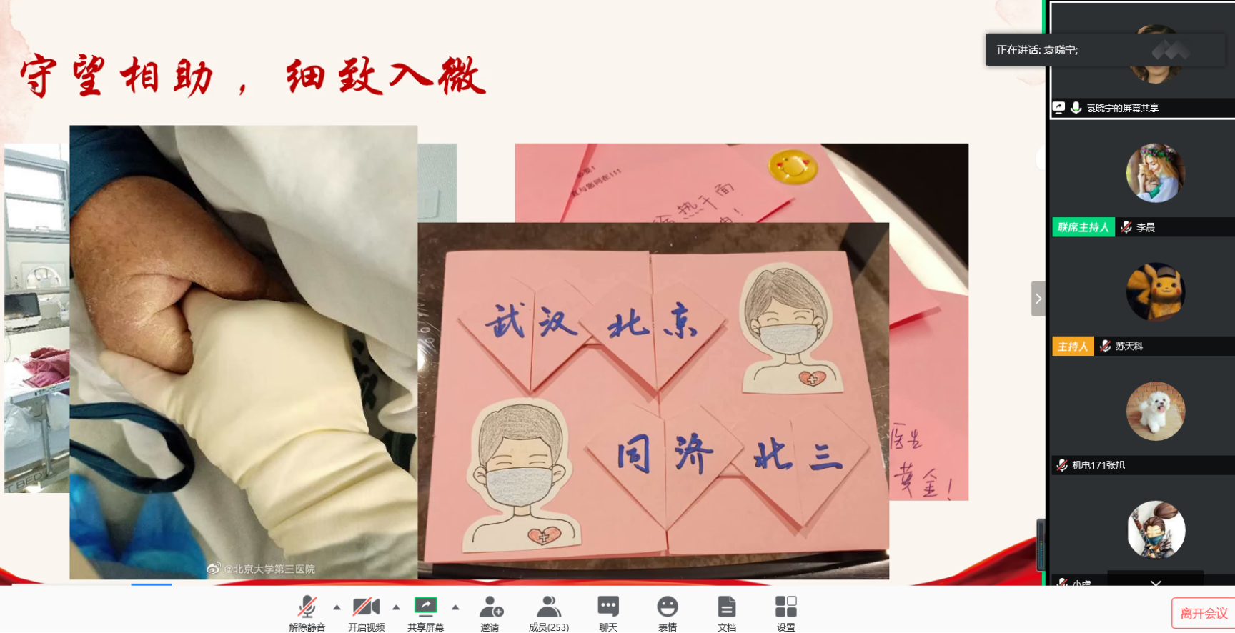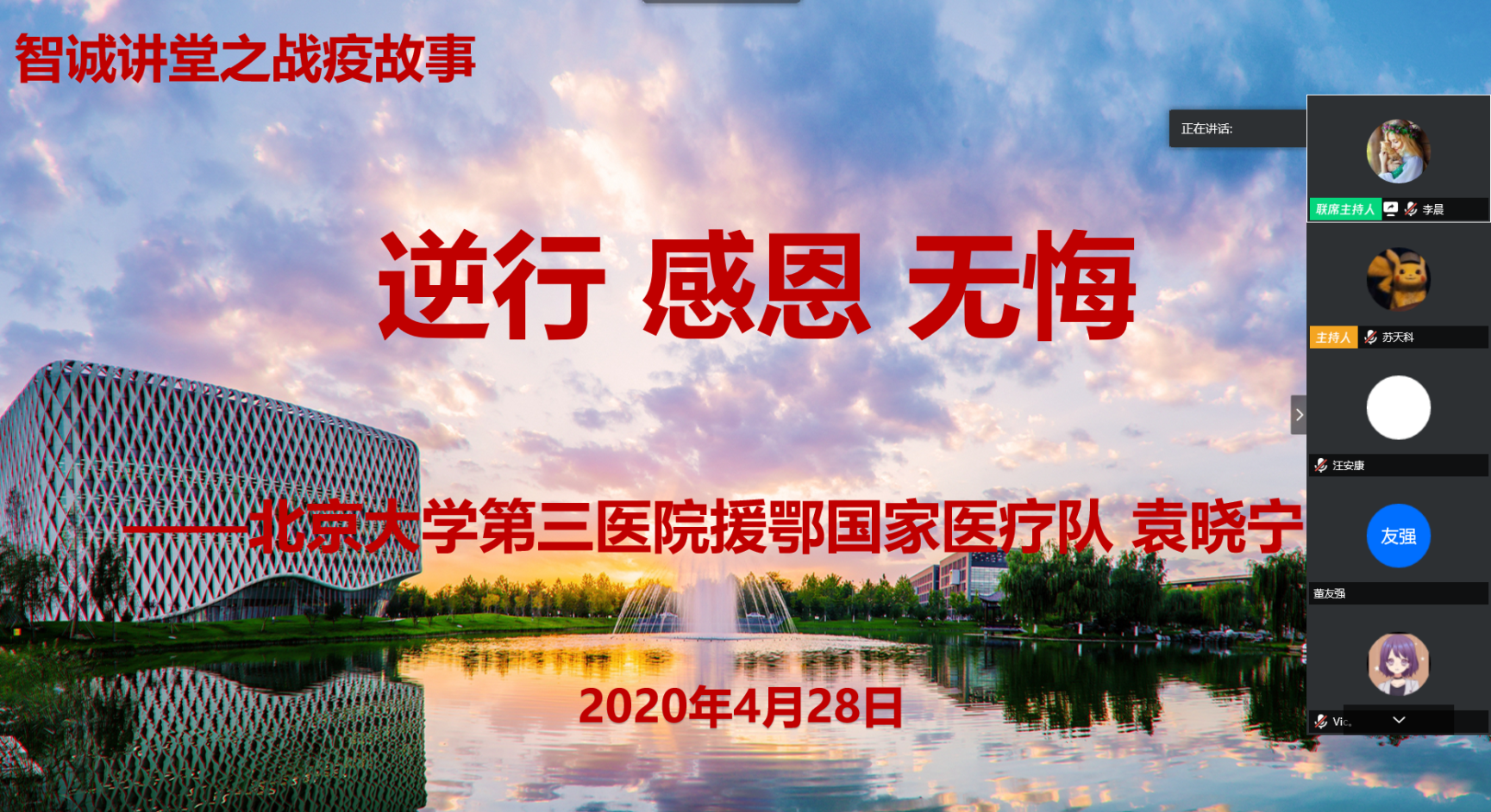 4月28日下午,百合漫画 与机电百合漫画 联合举办北京大学援鄂国家医疗队抗疫故事报告会。北京大学第三医院援鄂抗疫国家医疗队党总支书记袁晓宁以“逆行、感恩、无悔”为题精彩讲述抗疫难忘经历。报告会吸引300余名师生参加。