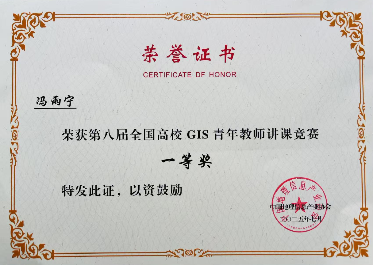 2025年7月19-20日,由中国地理信息产业协会和山东科技大学等主办的第八届全国高校GIS青年教师讲课竞赛在山东科技大学成功举办。我院教师冯雨宁老师通过预赛和决赛的激烈的角逐,于88所高校的参赛教师中脱颖而出,成功斩获一等奖。