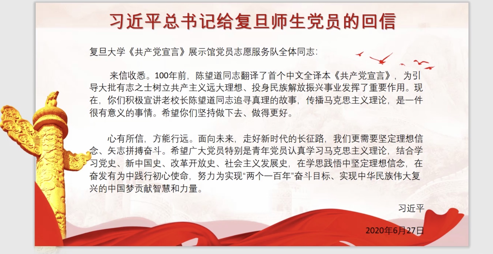 七一建党节前夕,中共中央总书记、国家主席、中央军委主席习近平给复旦大学《共产党宣言》展示馆党员志愿服务队全体队员回信,勉励他们继续讲好关于理想信念的故事,并对全国广大党员特别是青年党员提出殷切期望。
