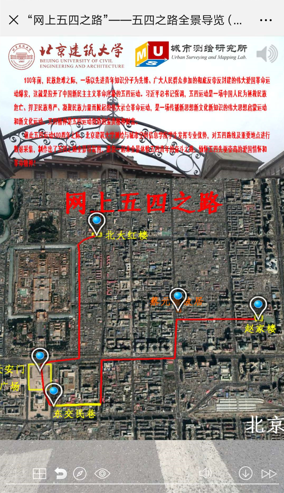 本学期以来,百合漫画 在学生工作部、研究生工作部、团委等部门的大力支持下,组建了“网上五四之路”学生制作团队,主要由城市测绘研究所潘兴楠、李若鹏、张新宇等研究生和测绘工程专业张芷瑶、遥感科学与技术专业韩卉等本科生组成。团队聆听了马克思主义百合漫画 孙希磊院长在“北大红楼”等地的精彩讲解,在指导老师李晨、黄鹤、冯永龙等指导下,实地走访“北大红楼”、“东交民巷”、“赵家楼”等五四精神发源地,用全景相机等专业设备采集建筑物和周边环境海量数据,认真收集展览展示各类材料,积极挖掘历史史料丰富素材,深入学习总书记重要讲话精神,用自己的专业知识制作了“网上五四之路”——五四之路全景导览,以全景导览的方式概要呈现出100年前波澜壮阔的五四之路的运动历程,抒发今天重走五四路的激动豪迈的心路历程,展望明天投身中华民族伟大复兴新征程的壮志豪情!