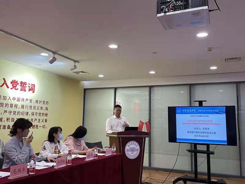 党日活动中,支部书记危双丰以“建筑遗产数字化与党史”为题做了主题分享。支部党员结合自身的专业和研究方向进行了发言交流。聂跃梅从“心怀远大理想、明确身份担当、了解红色基因、传承红色精神”等方面对学生党员提出希望和要求。冯永龙强调党史学习教育的目标,鼓励支部以党史学习教育为重要契机,结合学生专业特点和优势积极打造支部特色品牌。
