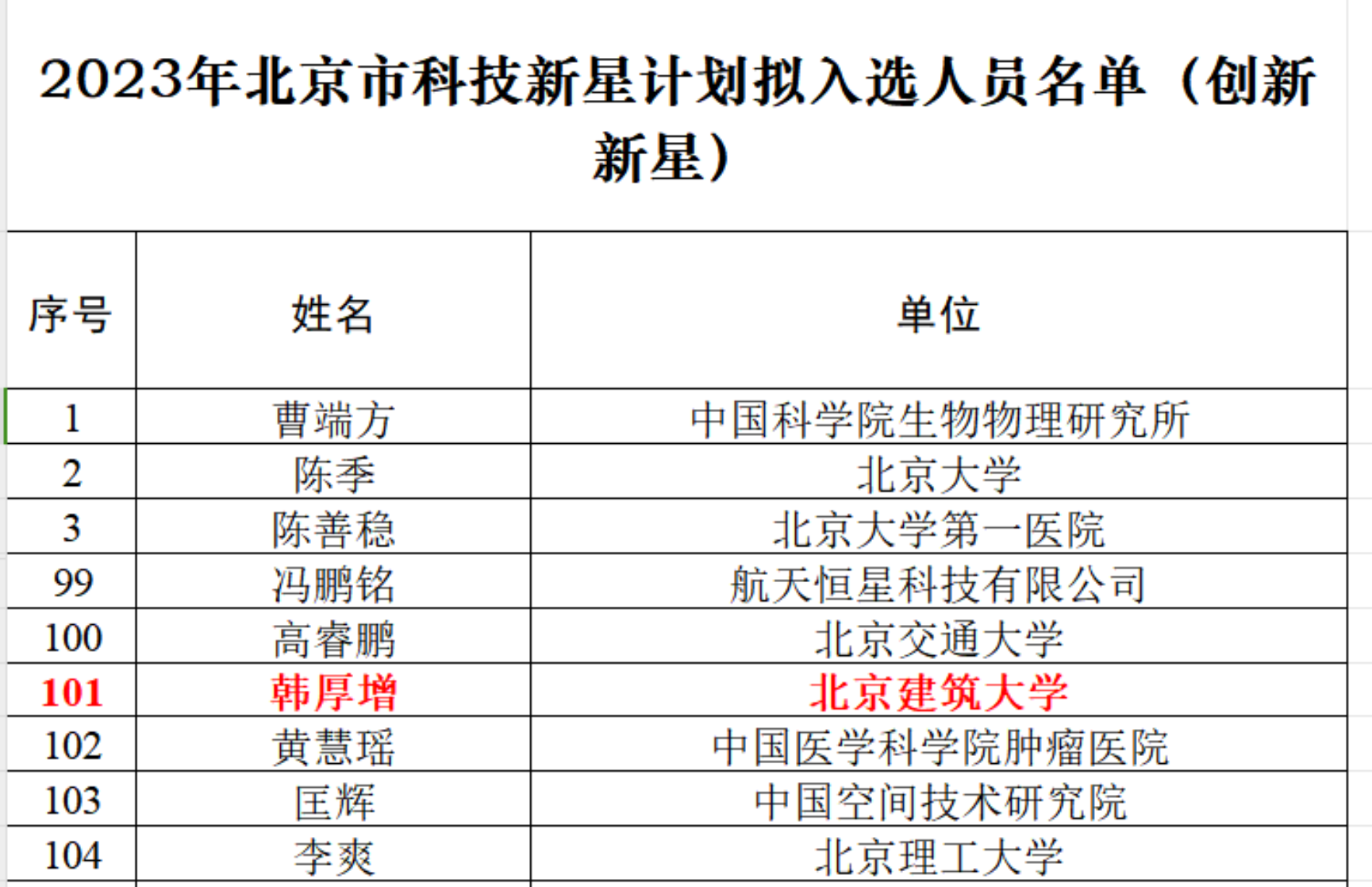 近日,北京市科学技术委员会、中关村科技园区管理委员会公布了2023年北京市科技新星计划评审结果,我院教师韩厚增成功入选2023年度“北京市科技新星(创新新星)计划”,展示了我院在科研教育领域的人才实力。