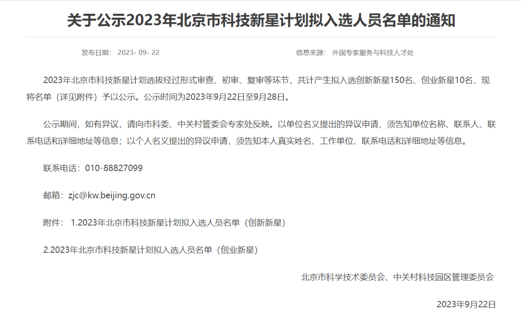 北京市科技新星计划是由北京市财政经费支持、北京市科学技术委员会组织实施的科技人才培养计划。旨在深入实施新时代人才强国战略,着力培育壮大首都青年科技人才队伍,打造一支具有国际竞争力的青年科技人才后备军,推进北京高水平人才高地建设。该计划评选严格,竞争激烈,要求候选人具备出色的研究能力和潜力,且研究方向需符合北京市的发展战略。由北京地区注册的高校、科研院所和企业等单位推荐候选人,2023年北京市科技新星计划选拔经过形式审查、初审、复审等环节,共计产生创新新星150名、创业新星10名。