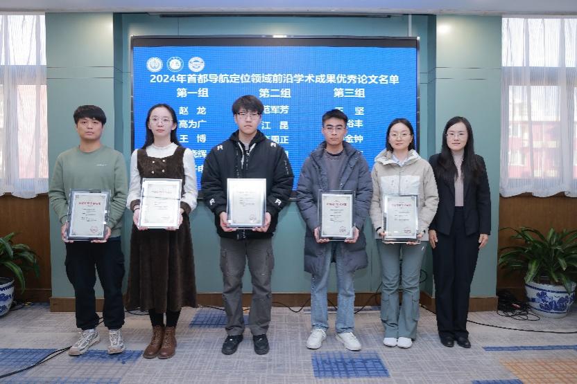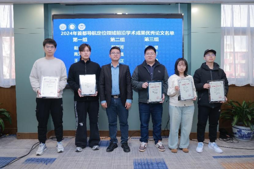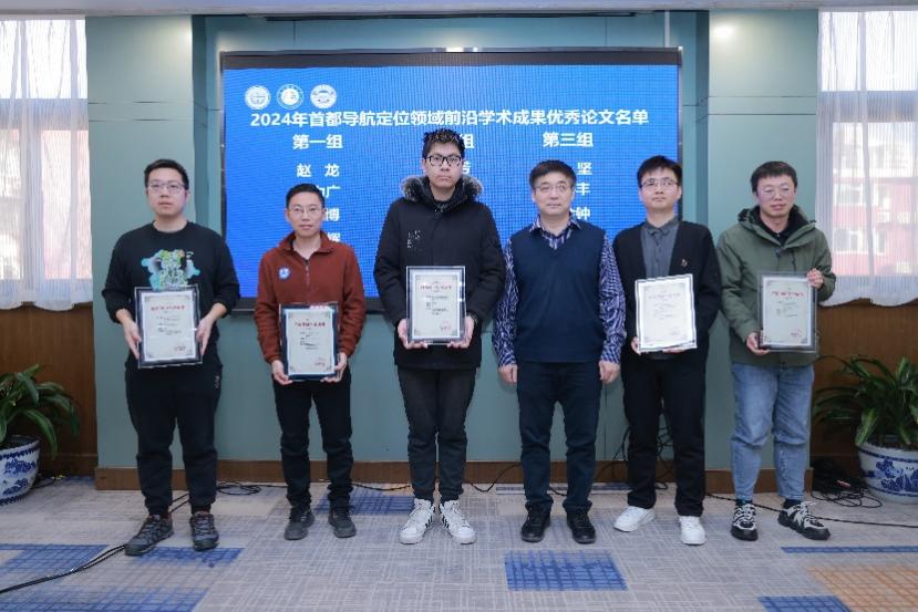 会议宣布2024年首都导航定位领域前沿学术成果优秀论文名单,我校科学技术发展研究院院长周理安,中国测绘科学研究院首席研究员党亚民院士、北京科协铁春雷为优秀论文学者代表颁发证书并合影留念。