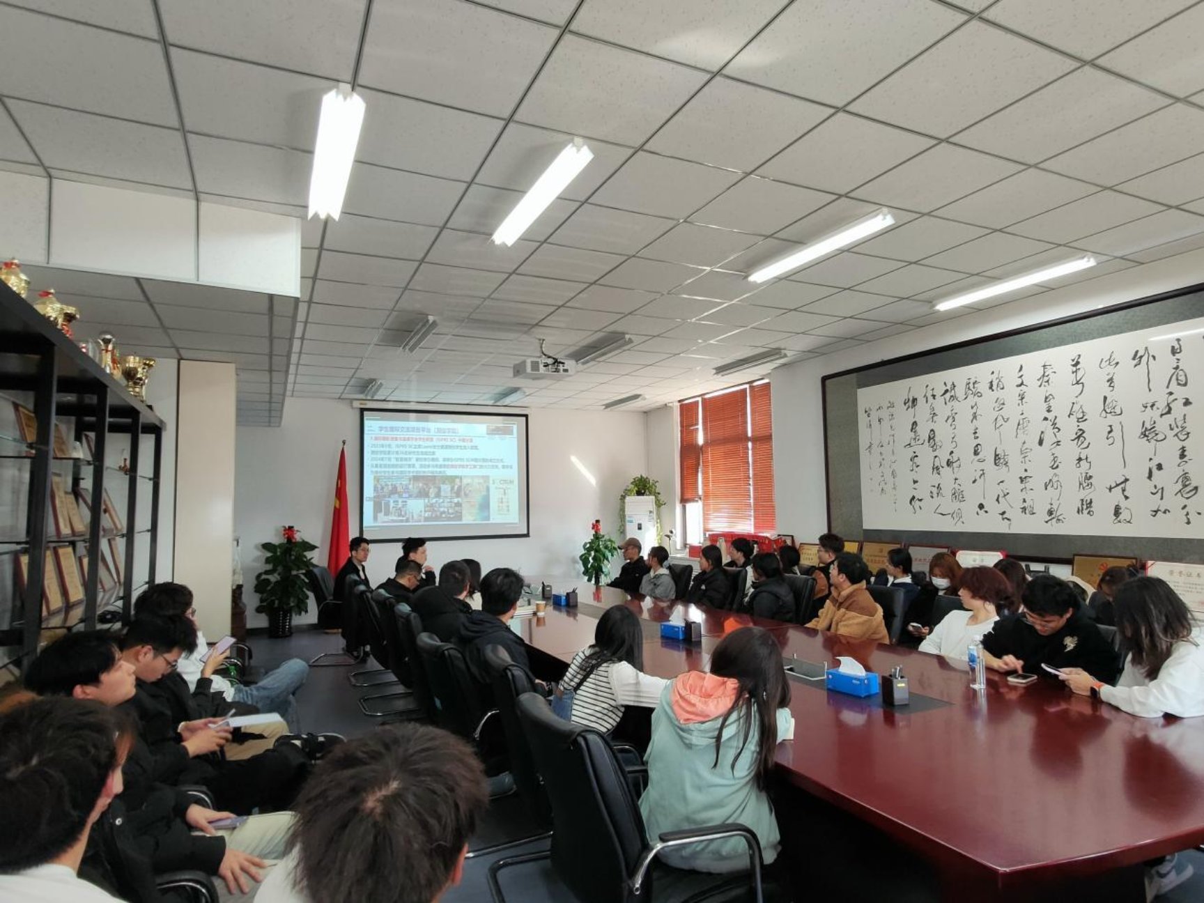会上,黄兴详细介绍了国际交流项目的类别、我院学生可参与的国际平台以及丰厚的奖学金政策,并对留学准备工作进行了全面的解读,鼓励学生积极申报各类国际交流项目,丰富个人阅历、拓宽国际视野。