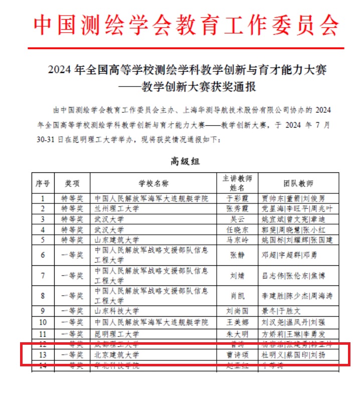 喜讯!我院荣获两项2024地理信息科技进步奖一等奖供稿:陈强 审核:谷天硕 8月28日至29日,2024中国地理信息产业大会在云南昆明召开。大会以“聚焦新质生产力 激发产业新活力”为主题,由云南省人民政...2024.09.04 -